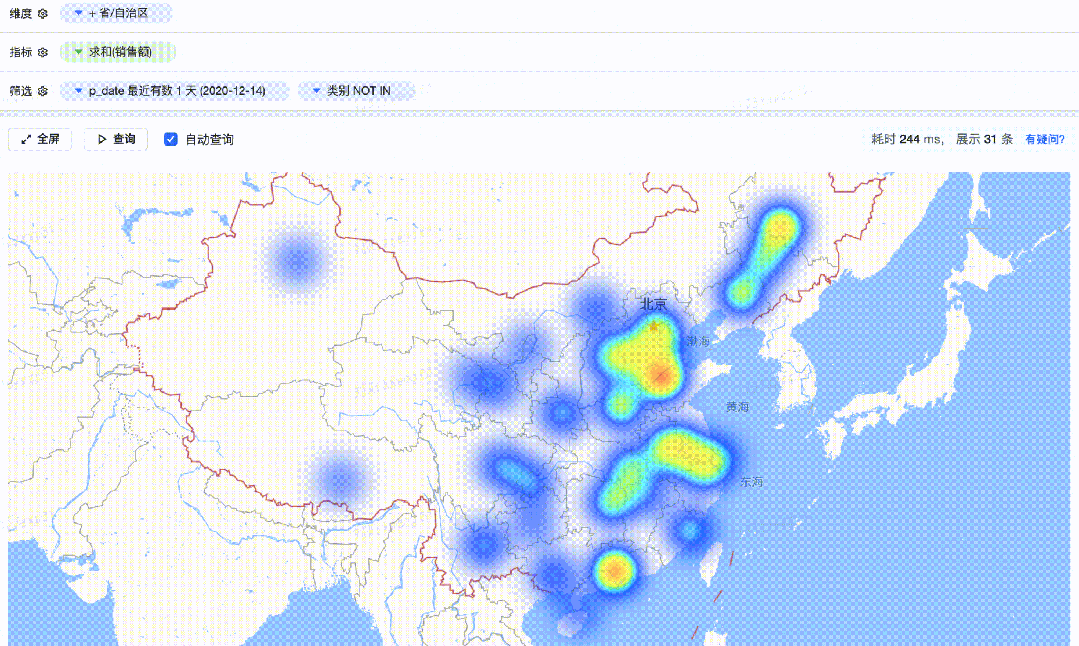 DataWind提供了Gis 地图来支持LBS需求,其中包括热力地图、散点地图、飞线地图、柱状地图等。
