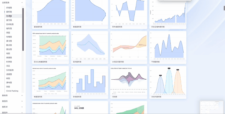 图表是 BI 产品中最常用的数据可视化工具之一。通过图表,用户可以更直观地了解数据的趋势、关系和分布。常见的图表类型包括折线图、柱状图、饼图、散点图等等。不同的图表类型适用于不同的数据类型和分析目的。例如,折线图可以展示时间序列数据的趋势,柱状图可以比较不同类别的数据,饼图可以显示数据的占比等等,选择适合的图表类型对于用户理解数据非常重要。