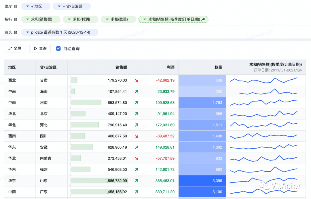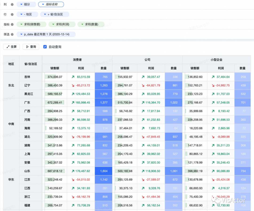 从代码中我们可以看到通过行列的定义和数据配置,可以表达数据的透视结构,同时在统计图表中使用的轴、图例、标注等组件可以完美的融合在表格中,极大增强了表格的可视化扩展能力。