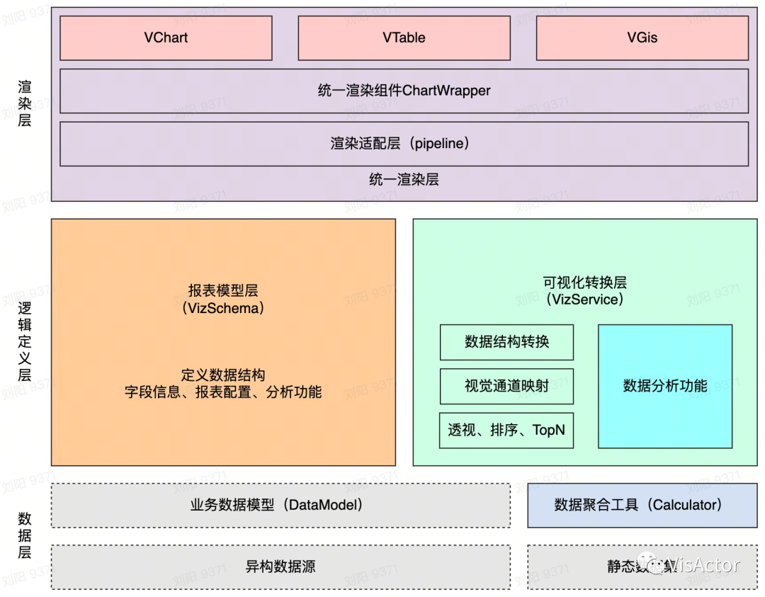 由于BI 系统的复杂性,以及需要通用图表和表格能力之外的定制化可视化能力,DataWind 在VisActor的扩展机制基础上,做了一层面向BI系统的可视化封装。架构设计如下: