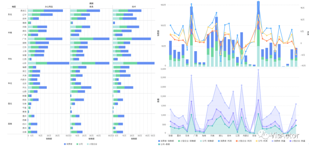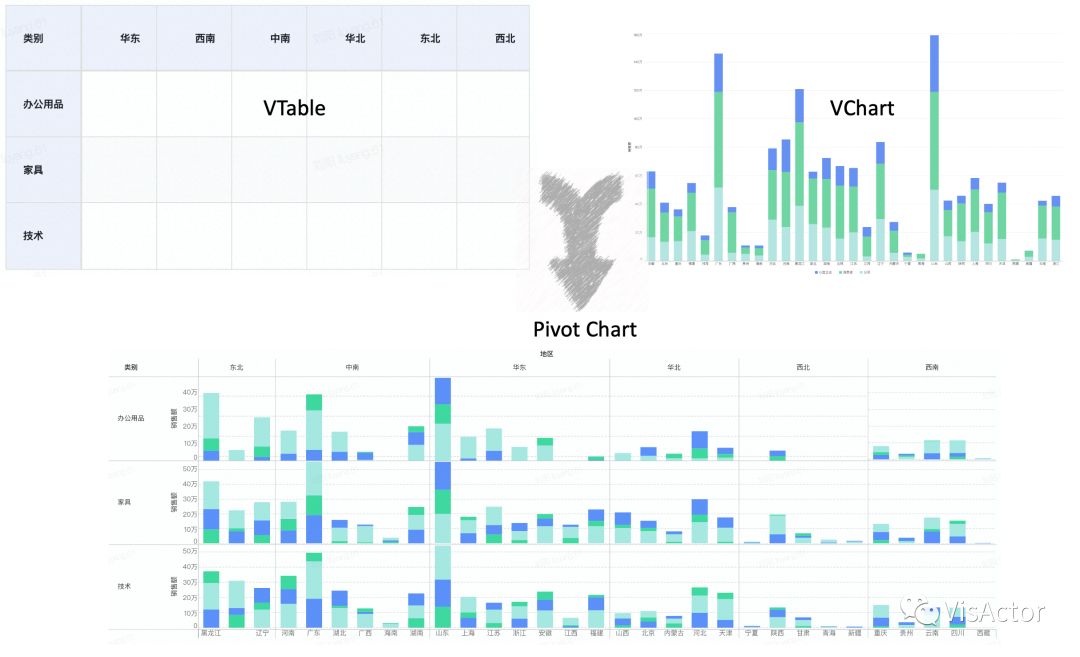 而组合图表与透视图表的实现,则是结合了VChart与VTable各自的优势特性合并而来,得益于VisActor统一的底层渲染实现,可以容易的使用VTable的布局能力,嵌套VChart的图表渲染能力实现组合图表与透视图表。