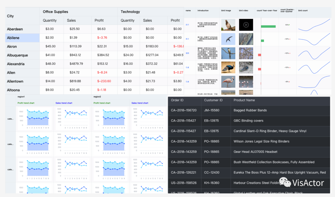 DataWind中丰富的可视化展现形式得益于开源可视化解决方案 VisActor,DataWind 重度使用了图表组件VChart 和 多维表格组件库 VTable。