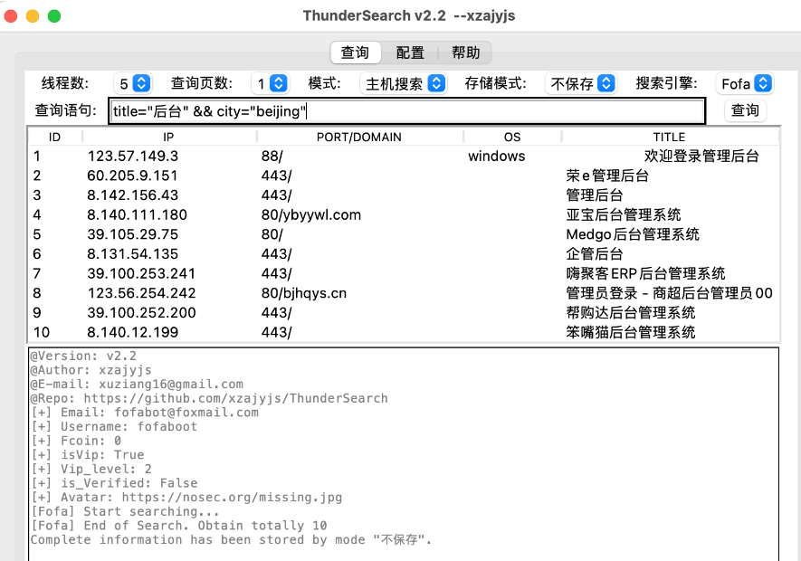 【Fofa、Zoomeye等】闪电搜索网络化测试信息工具的支持;GUI引擎引擎图形化网络测试信息工具;支持通过图形化修改配置信息,支持账号密码和API-KEY登陆,支持多个网络资产搜索引擎,显示完整的内容查询保存至指定文件或结果部分数据库,支持查询用户个人信息。https://github.com/xzajyjs/ThunderSearch