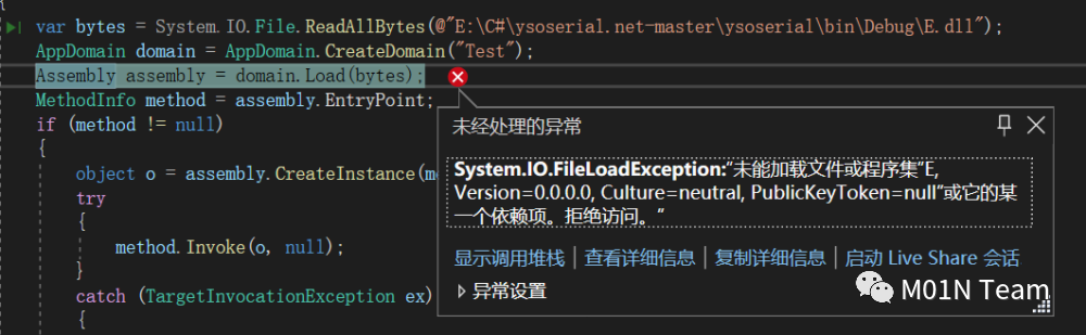 其原因是Appdomain.Load(byte[])加载的程序集,在Appdomain间是无法共享类型信息的。如果默认Appdomain没有加载这个程序集,那么就不会有关于此程序集的类型信息,第二个Appdomian用Load(Byte[])加载后,要把程序集对象传递到默认Appdomain中,但默认Appdomain找不到此对象的信息,所以会报错。解决方式就是使用跨应用程序域访问。