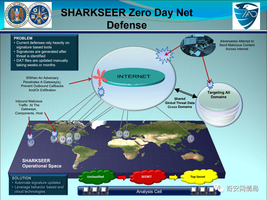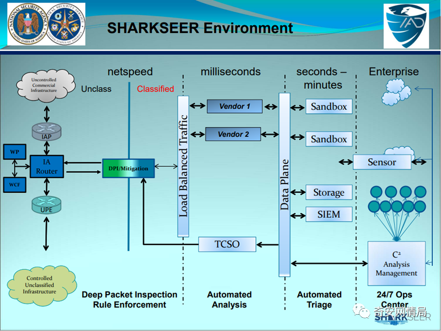SHARKSEER利用商品化的产品和技术,通过利用、动态生成和增强全球威胁知识来快速保护网络,检测并缓解基于网络的恶意软件零日威胁和高级持续威胁。该项目主要有两项目标:一是保护互联网接入点(IAP)。即为所有 10 个美国防部IAP 提供高度可用且可靠的自动感知和缓解功能。通过自动化数据分析流程,利用美国安局特有知识来丰富商业行为和启发式分析以及威胁数据,从而构成发现和缓解的基础。二是实现网络态势感知和数据共享。即利用美国安局独特的知识和流程丰富公共恶意软件威胁数据,通过自动化系统与合作伙伴实时共享相关数据。