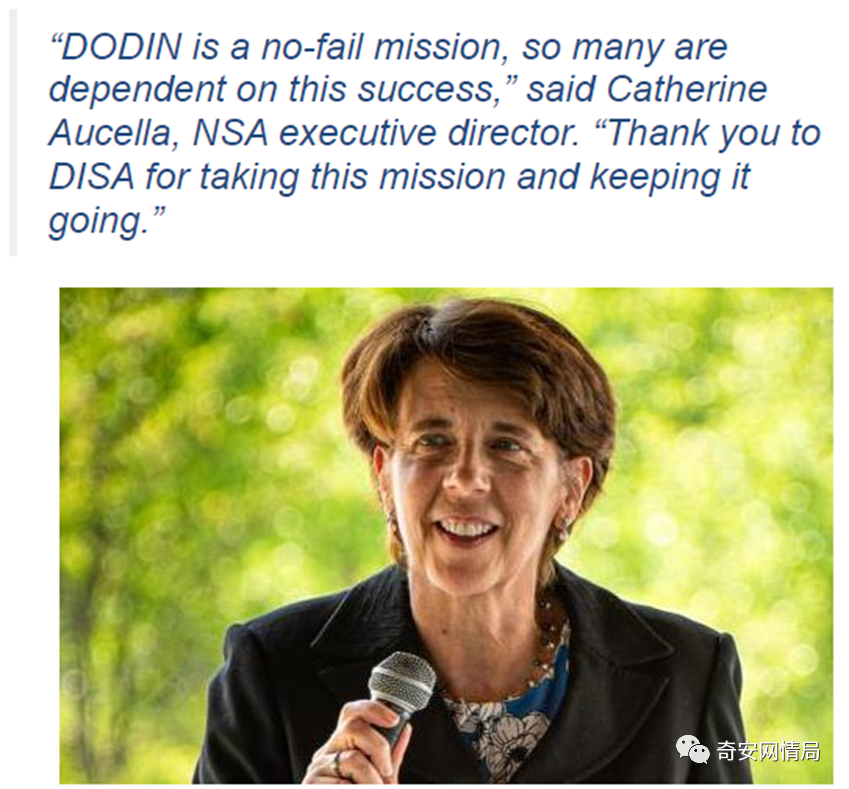 7 月 20 日,NSA 执行主管 凯瑟琳·奥塞拉在SHARKSEER过渡庆典上发表讲话称, “DODIN 是一项不能失败的任务,因此许多人都依赖于这一成功。感谢DISA承担这一使命并坚持下去。”