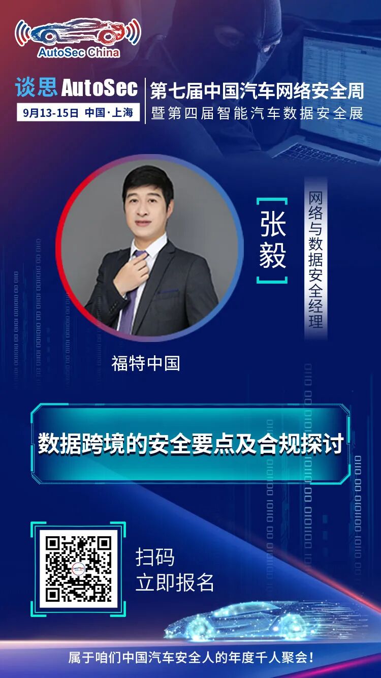 此次,福特中国网络与数据安全经理张毅先生,将在AutoSec 2023第七届中国汽车网络安全周上分享“ 数据跨境的安全要点及合规探讨 ”的精彩话题。