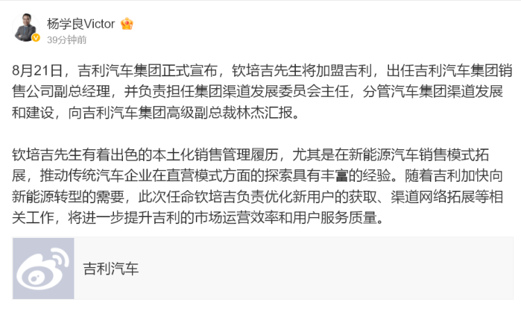 8月21日讯,吉利汽车集团正式宣布,钦培吉将加盟吉利,出任吉利汽车集团销售公司副总经理,并负责担任集团渠道发展委员会主任,分管汽车集团渠道发展和建设,向吉利汽车集团高级副总裁林杰汇报。