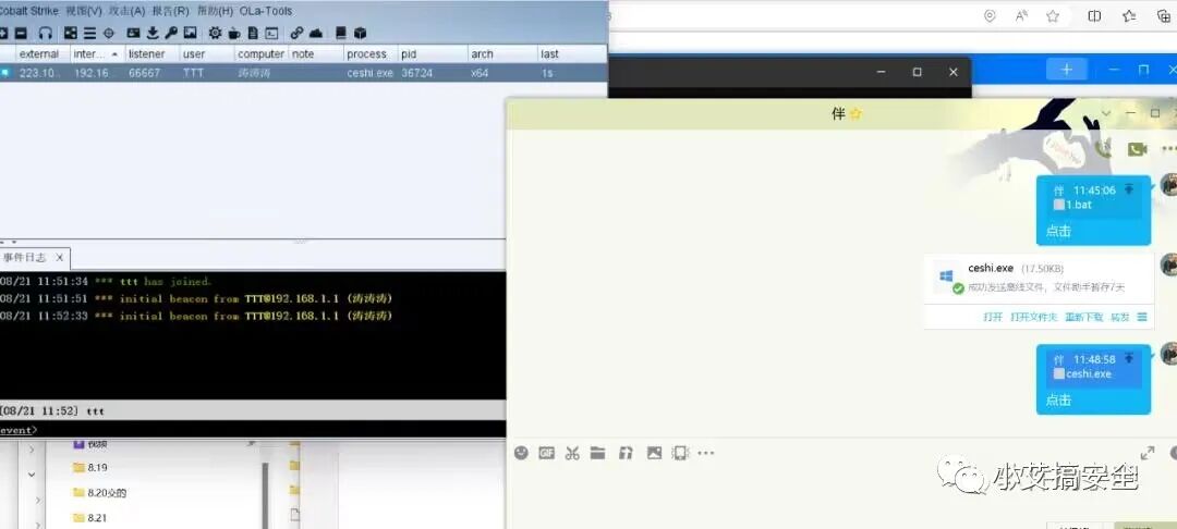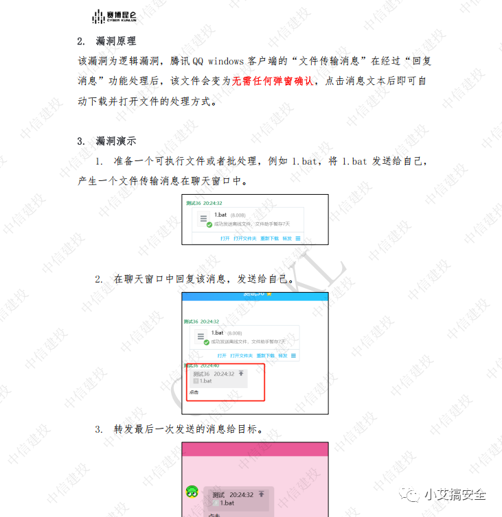 该漏洞为逻辑漏洞,利用 QQ 客户端的逻辑缺陷进行攻击,被攻击方在点击消息内容(链接)时,不会弹窗提示,自动下载执行,在攻击者利用的层面,可降低攻击者钓鱼等攻击手段的难度复现图如下: