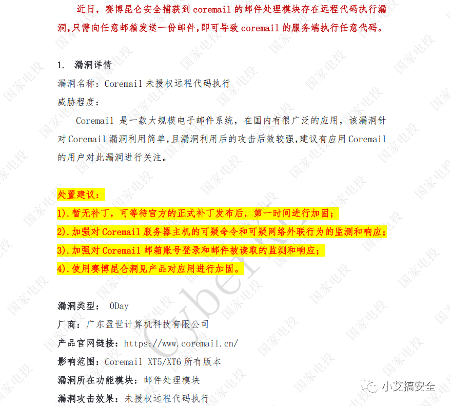 Coremail 的邮件处理功能存在溢出漏洞,利用该漏洞可导致未经授权的攻击者在邮件服务端执行任意代码。该漏洞利用较为简单且隐蔽,只需向任意邮箱地址发送一封邮件,即可实现服务端 RCE,导致内网横向、任意邮箱登录和任意邮件查看。