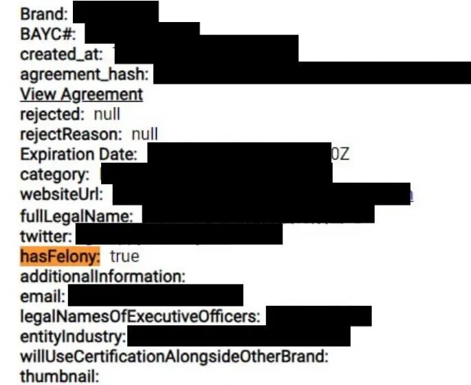 2023 年 8 月 16 日,链上分析师 ZachXBT 发推称,BAYC 推出的链上许可申请平台 Made by Apes 的 SaaSy Labs APl 存在一个问题,允许访问 MBA 申请的个人详细信息。该问题在披露前已向 Yuga Labs 反馈,现已修复。Yuga Labs 回应称,目前不确定是否存在数据滥用的情况,正在联系任何可能暴露信息的人,并将为任何可能需要的用户提供欺诈和身份保护。