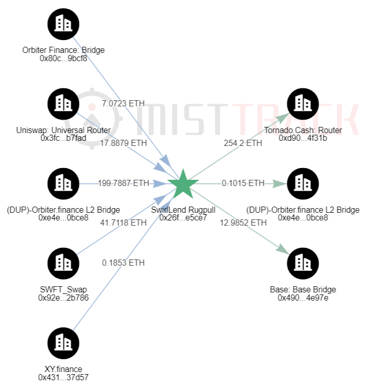2023 年 8 月 16 日,借贷协议 SwirlLend 团队从 Base 盗取了约 290 万美元的加密货币,从 Linea 盗取了价值 170 万美元的加密货币,被盗资金均被跨链到以太坊。截至目前,部署者已将 254.2 ETH 转移到 Tornado Cash。SwirlLend 官方 Twitter 和 Telegram 帐户已经注销,其官方网站也无法访问。据 MistTrack 分析,部署者使用了 SwftSwap、XY Finance、Orbiter Finance 等,同时,发现了如下 IP:50.*.*.106、50.*.*.58、50.*.*.42。