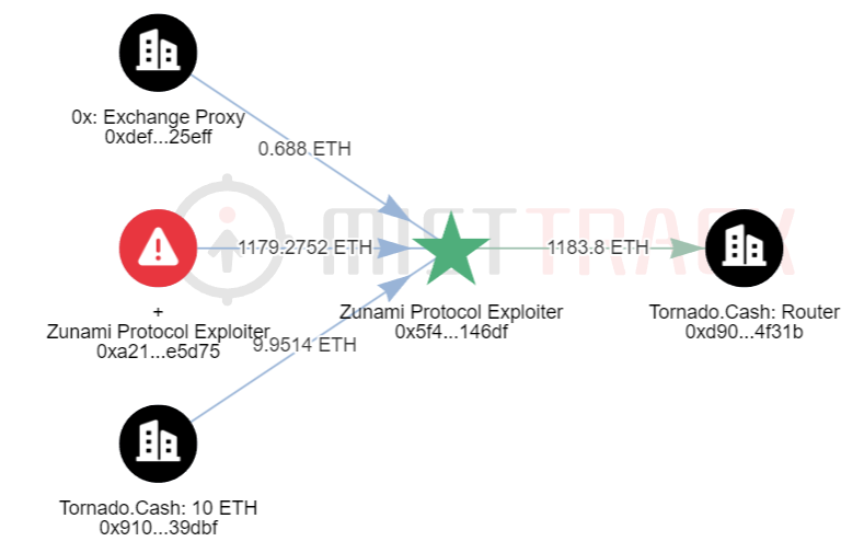 2023 年 8 月 14 日,以太坊上 Zunami Protocol 协议遭遇价格操纵攻击,损失 1,179 个 ETH(约 220 万美元)。事件发生的原因是漏洞合约中 LP 价格计算依赖了合约自身的 CRV 余额,和 CRV 在 wETH/CRV 池中的兑换比例。攻击者通过向合约中转入 CRV 并操控 wETH/CRV 池子的兑换比例,从而操控了 LP 价格。据 MistTrack 分析,目前 ETH 都已转入 Tornado Cash。