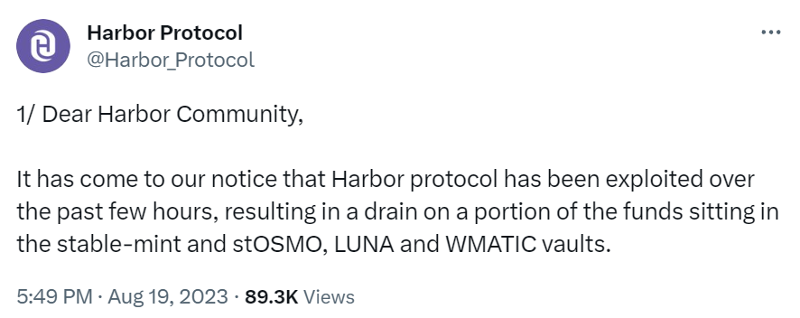 2023 年 8 月 19 日,Cosmos 生态跨链稳定币协议 Harbor Protocol 发推表示,Harbor Protocol 被利用,导致 stable-mint、stOSMO、LUNA 和 WMATIC 金库中的部分资金被耗尽。从目前收集到的信息来看,攻击者使用以下地址执行所有操作:comdex1sma0ntw7fq3fpux8suxkm9h8y642fuqt0ujwt5。据悉,Harbor Protocol 在攻击中损失了 42,261 枚 LUNA、1,533 枚 CMDX、1,571 枚 stOSMO 和 18,600 万亿枚 WMATIC。