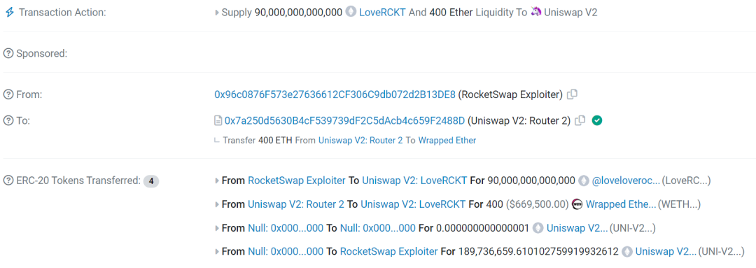 2023 年 8 月 15 日,Base 生态项目 RocketSwap 遭遇攻击,攻击者窃取了 RCKT 代币,将其转换为价值约 86.8 万美元的 ETH 并跨链到以太坊,然后黑客创建了一个名为 LoveRCKT 的 memecoin,目的可能是想利用盗来的资产操纵市场情绪以谋取个人利益。