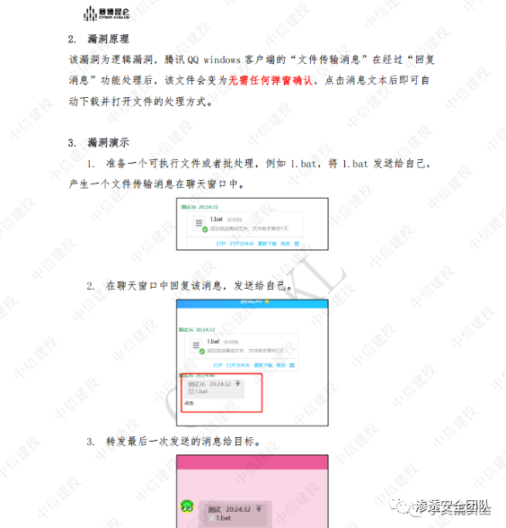 这个漏洞是一种逻辑漏洞,利用了 QQ 客户端中的逻辑缺陷进行攻击。当被攻击方点击消息内容(链接)时,不会出现弹窗提示,而是自动下载并执行。这种漏洞的存在使攻击者能够更轻松地进行钓鱼等攻击手段。