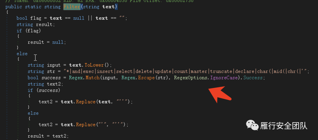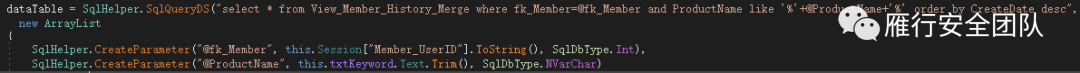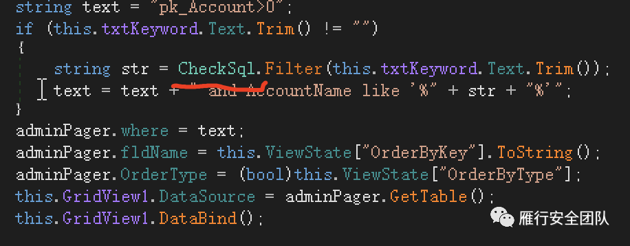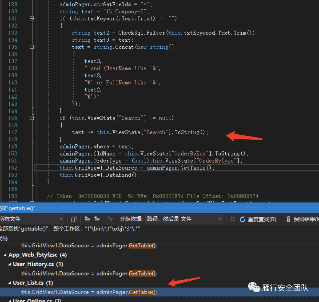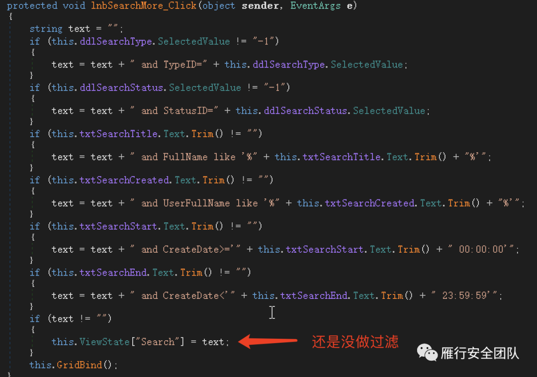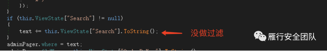 继续寻找,终于找到一处作者疏忽的地方。当this.ViewState["Search"]不为null的时候,给text值追加上this.ViewState["Search"]的值,而这里是没有做过滤的。