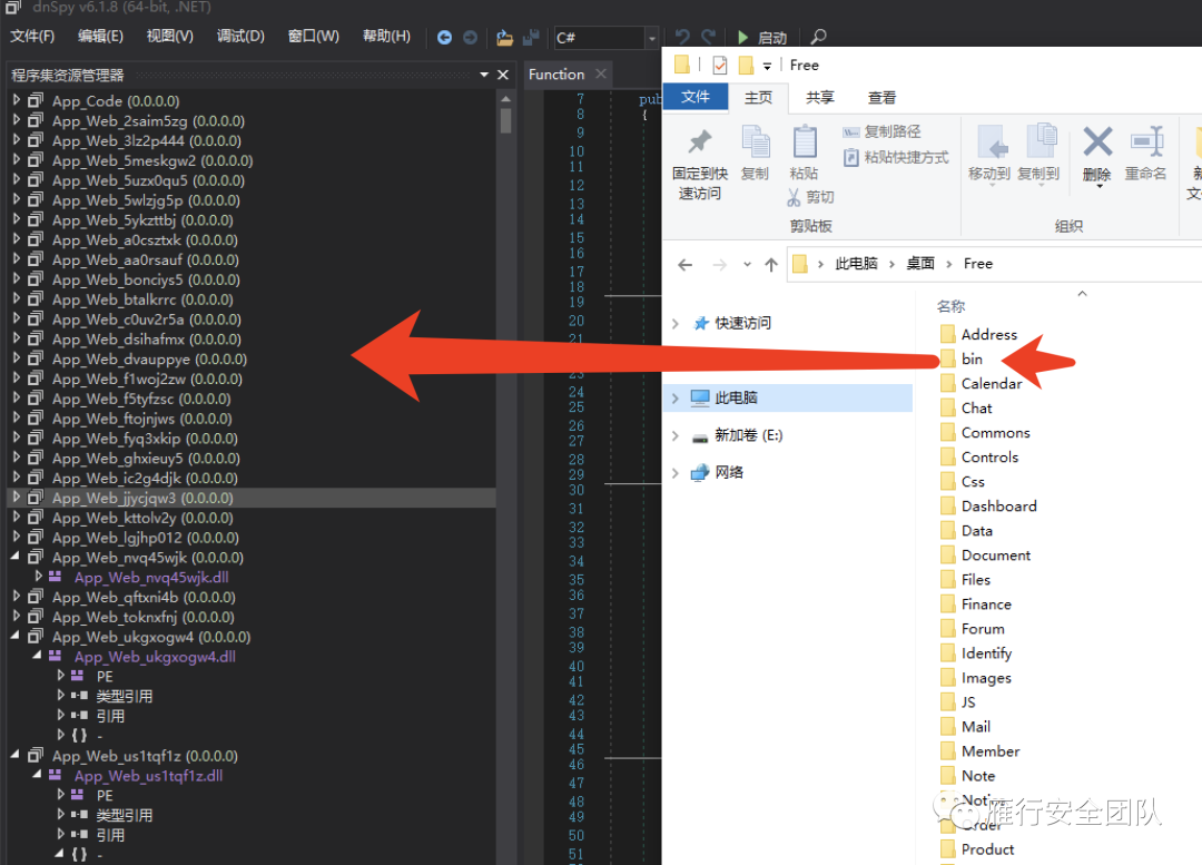这里我直接把bin目录拖入dnspy中(dnspy是反编译工具,用于调试.net 程序)。