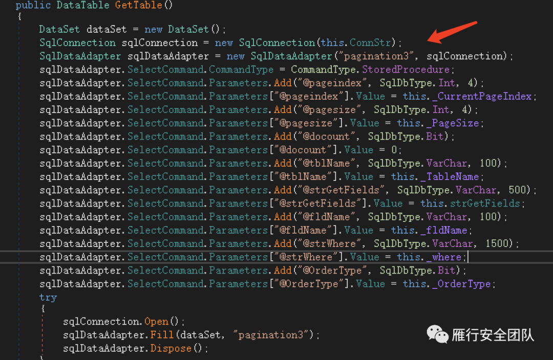 又多看了一下,使用SqlDataAdapter都是调用的GetTable()方法,于是全局搜索该方法。果然找出多个类似的sql注入。