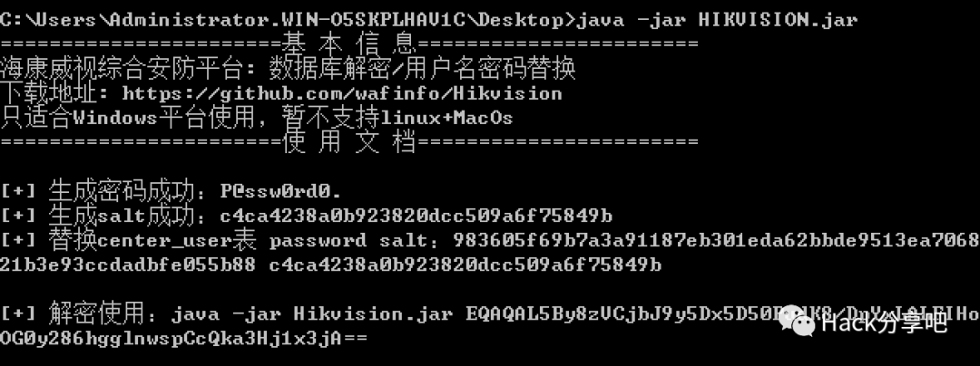 直接运行Hikvision.jar输出替换sysadmin用户password和salt。