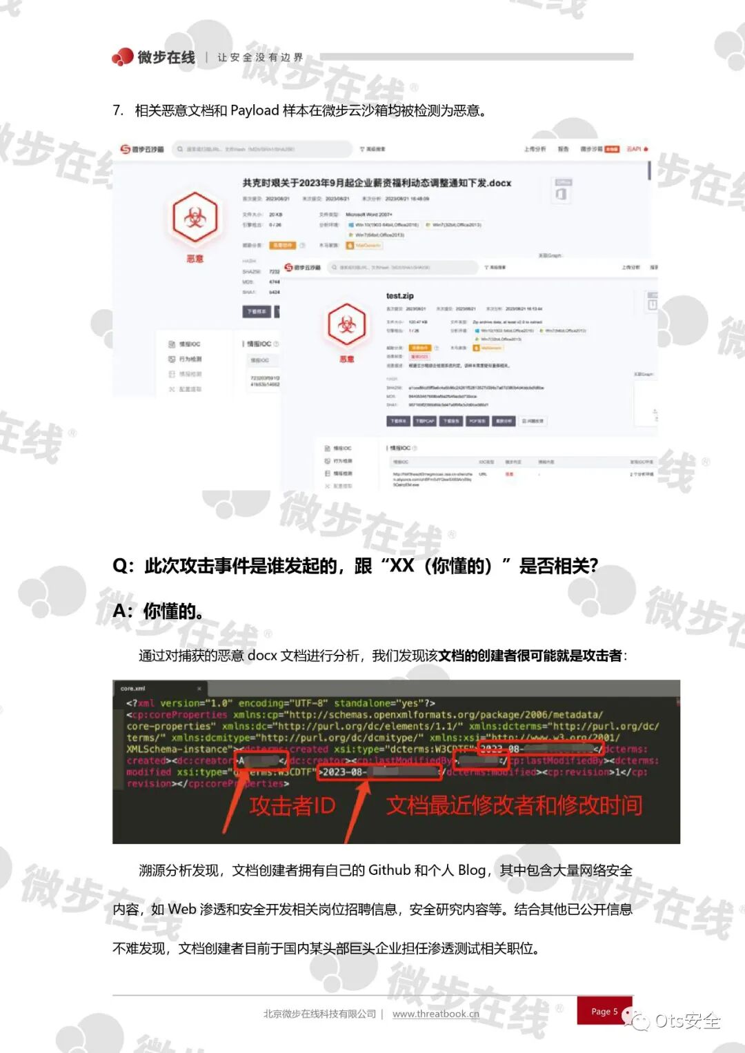 还有一项是关于样本问题,样本可能是因为HVV期间的用于演练并未公开样本和PCAP,但是在下面群友分享的微步情报局的报告有一段是样本文档的创建者朔源包含了一些信息,所以话也不多说了,感兴趣的可以直接看报告!