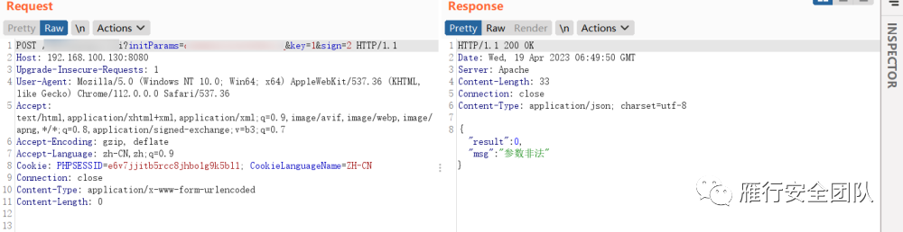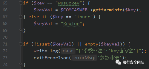 往下看发现71行对$keyVal有限制,但是可以通过$key控制,就是需要$key == "wusuokey" || $key == "inner",这里就不看getfarminfo方法了(悄悄说一下这里上个版本可以getshell噢),这里直接给$key赋值为"inner",让$keyVal = "Realor"。