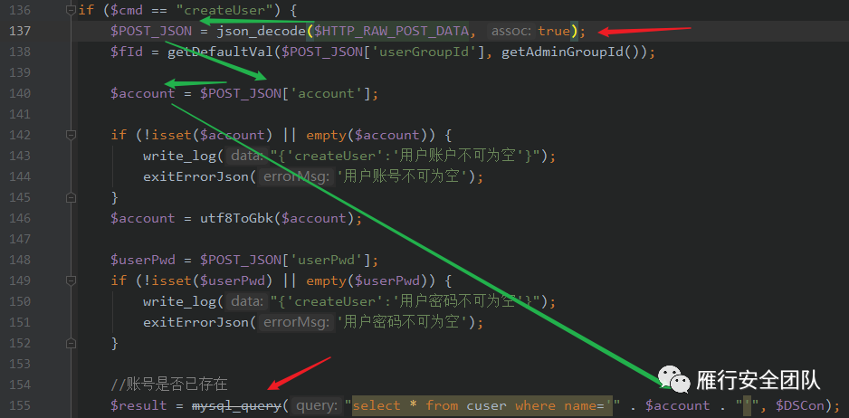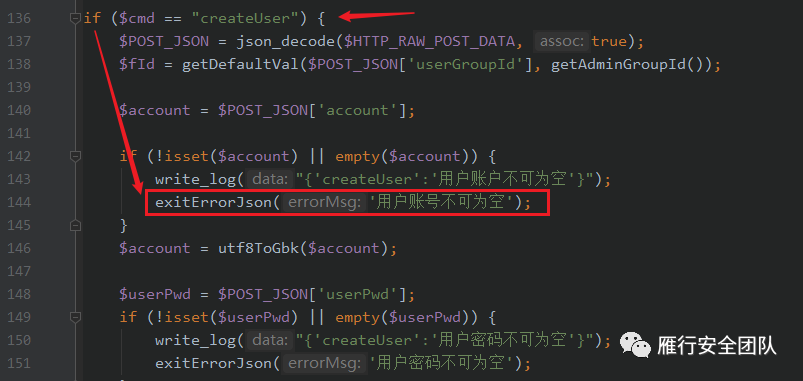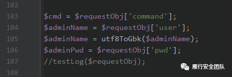 那么我们先让cmd等于"createUser"好通过if ($cmd == "createUser")判断,往上找发现103行$cmd通过$requestObj['command']赋值。
