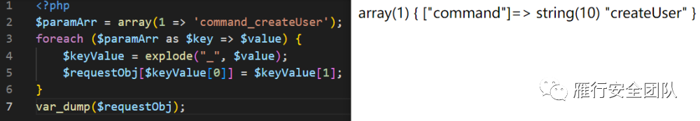 然后explode函数把"command_createUser"通过"_"分割打散为数组,就成了$keyValue = array('command' => 'createUser'),$keyValue[0]就等于"command",$keyValue[1]就等于"createUser",$requestObj[$keyValue[0]]就等于"createUser"了。