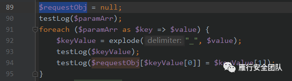 分析一下这段代码的逻辑,其实就是循环取$paramArr的键值,然后使用explode函数把$value通过"_"分割打散为数组,并赋值给$keyValue,然后把$keyValue[0]赋值给$requestObj当作键名,$keyValue[1]作为值赋给$requestObj[$keyValue[0]]。