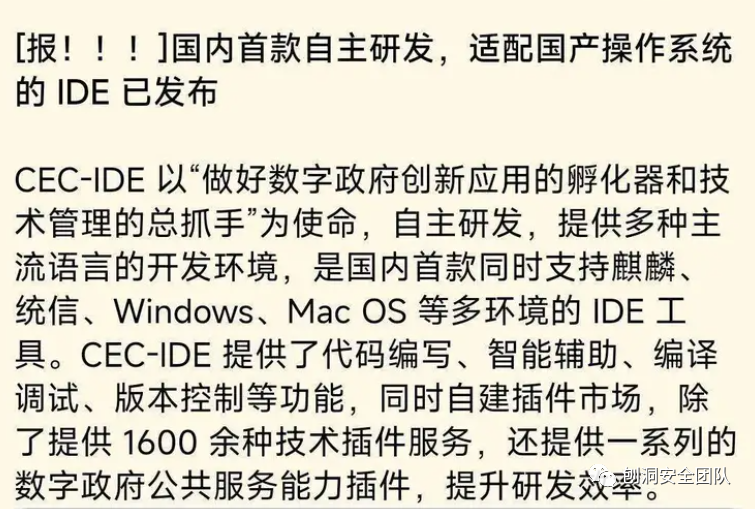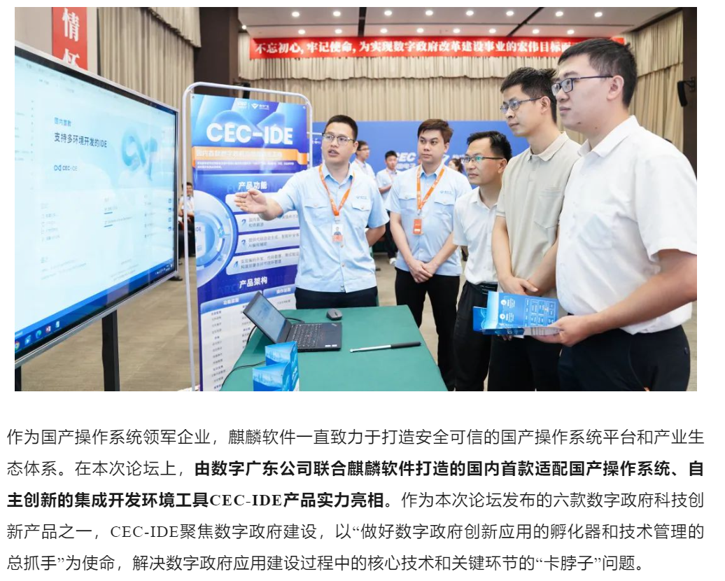 https://mp.weixin.qq.com/s/v_smby8ua1vmnxI8mOhq8作为国产操作系统领军企业,麒麟软件一直致力于打造安全可信的国产操作系统平台和产业生态体系。在本次论坛上,由数字广东公司联合麒麟软件打造的国内首款适配国产操作系统、自主创新的集成开发环境工具CEC-IDE产品实力亮相。作为本次论坛发布的六款数字政府科技创新产品之一,CEC-IDE聚焦数字政府建设,以“做好数字政府创新应用的孵化器和技术管理的总抓手”为使命,解决数字政府应用建设过程中的核心技术和关键环节的“卡脖子”问题。
