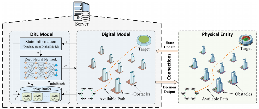 通信桥梁:它连接物理实体和数字模型,是两者之间的连接桥梁;可以通过4G/5G或卫星等方式建立。连接是双向的,为群集运动问题提供实时服务。一方面,物理实体将传感器数据传输到中央服务器进行数字模型构建。另一方面,中央服务器将DRL模型生成的控制策略输出到物理实体,以进行无人机合作。
