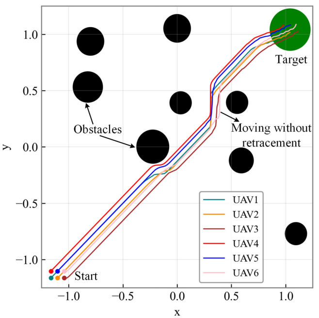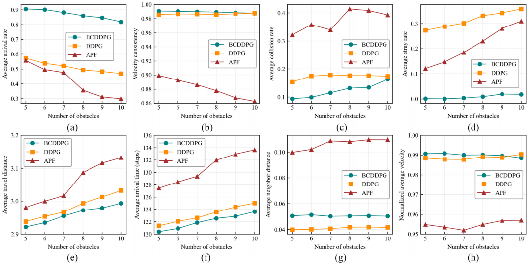 与 DDPG 和 APF 相比,BCDDPG 用更少的时间、更高的能效和更好的协同效应来实现集群运动任务。BCDDPG 在平均到达率、平均碰撞率、平均偏离率等性能指标上表现更好。为了更好地说明 BCDDPG 相对于传统 APF 方法的优势,设计了一个特定的环境,分别观察采用 BCDDPG 和 APF 作为集群运动方法的无人机的运动轨迹和运动状态。