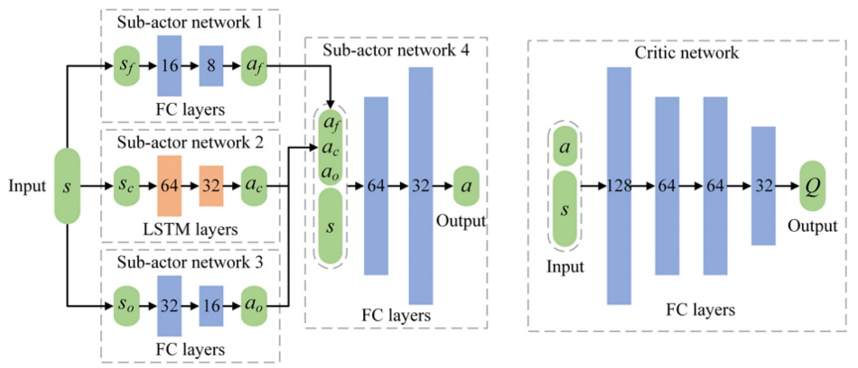 图3展示了BCDDPG中演员和评论家的网络架构。演员和评论家网络采用多个子演员网络和LSTM网络的结构使得BCDDPG能够生成智能决策并实现无人机之间的协同行动。