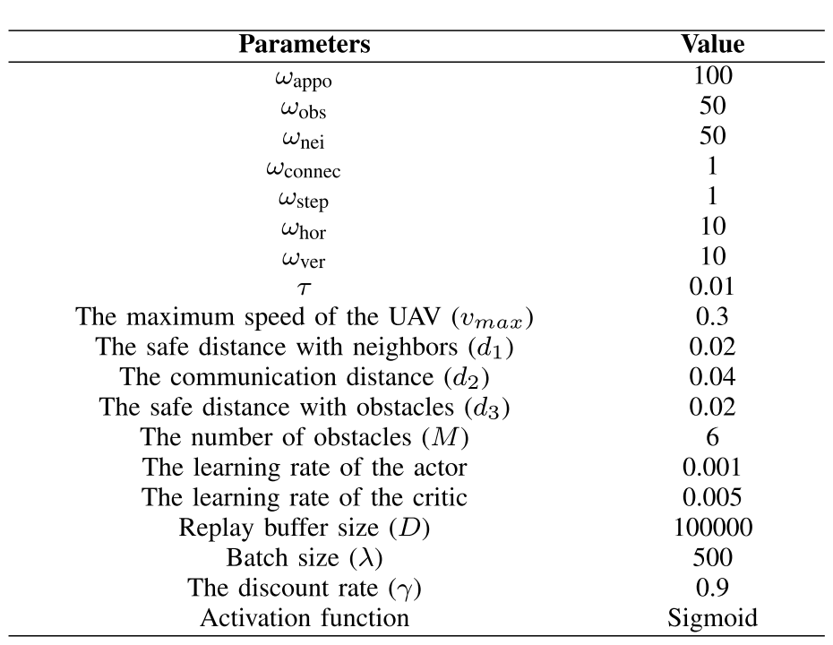 奖励函数中的参数w_appro、w_obs、w_nei、w_connec、w_hor、w_ver均为正常数,具体在仿真参数设置中展示。