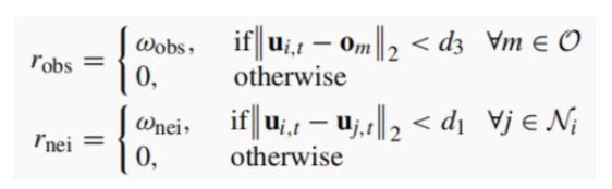 2)无人机i在时间步长t与障碍物或邻居碰撞的负奖励定义为
