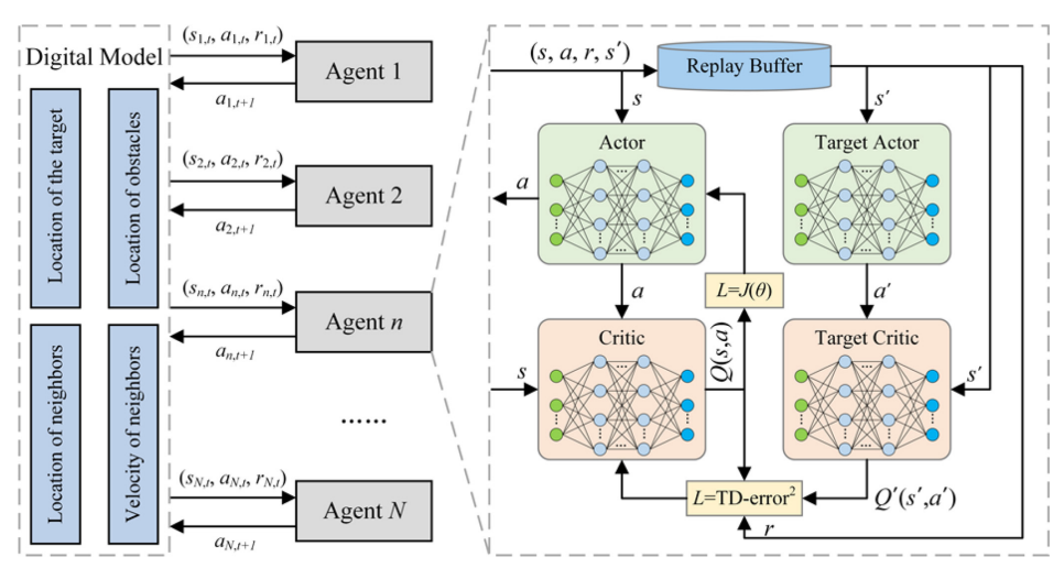 DRL模型:它提供智能决策服务,训练过程中,从数字模型中提取状态信息。及时输出集群运动的控制策略。