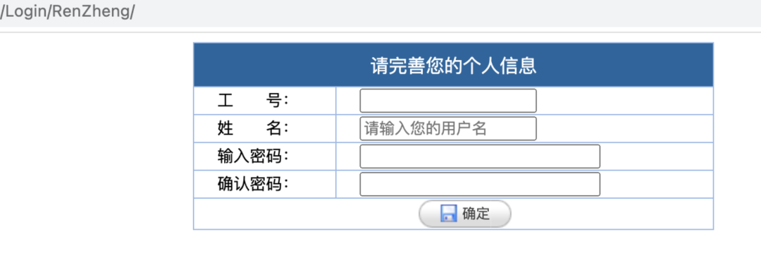 访问一下发现此处为密码重置,只需要知道工号和姓名,因上一步获取的敏感信息包含工号和姓名,即可完成任意密码重置。