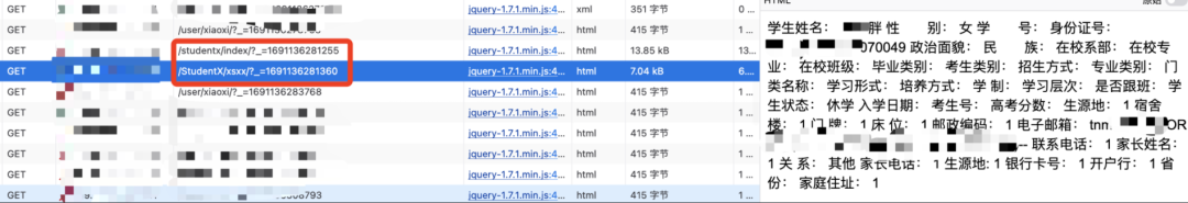 开启f12大法,点击个人信息时发现访问了/Student/Xsxx的接口,并返回一个学生数据。