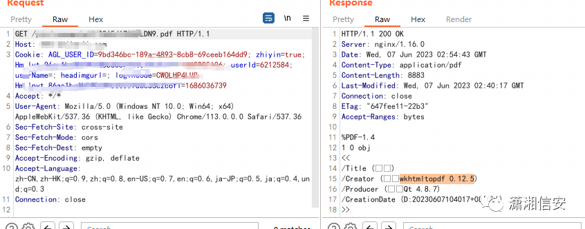 一般可以通过获取后端解析的组件及版本来获取更多信息,从下载的pdf中,可以文件的头部信息可以获取创建者或者pdf文件信息