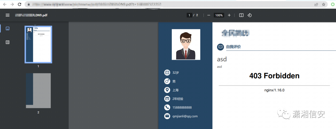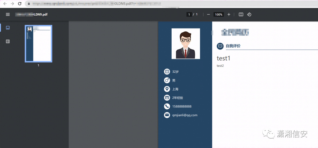 然后我们发现,网站有一个功能可以把简历转成pdf并下载,而在线编辑的是html格式,而且这一转换过程是在后端完成,并且导出的pdf中标签依然是被解析的,如下图所示,导出的pdf中上方的字体也明显变大,说明h1标签被解析