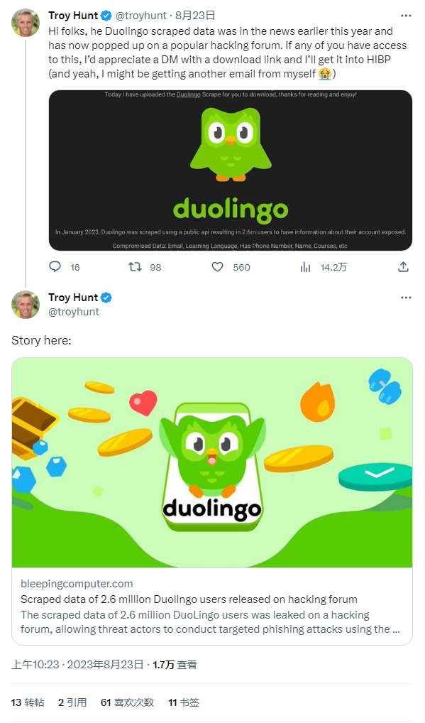 开发者 Troy Hunt 已经将 260 万多邻国用户数据整合到 Have I been Pwned 网站,IT之家在此附上链接,使用多邻国的用户可以点击,检查个人信息是否被泄露。