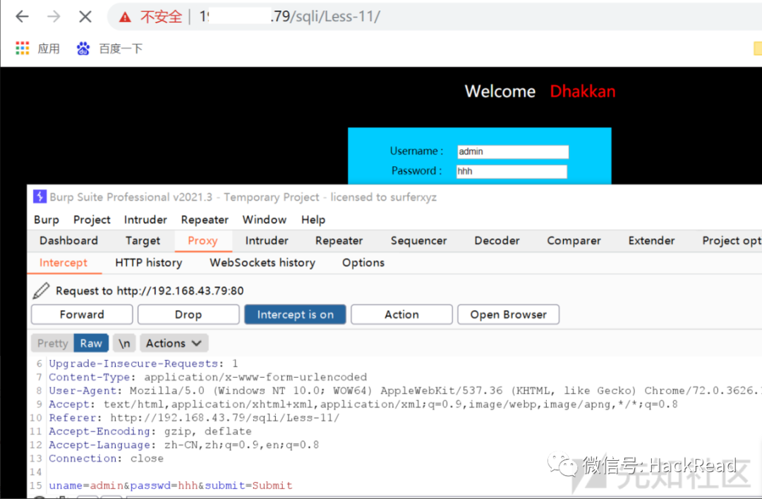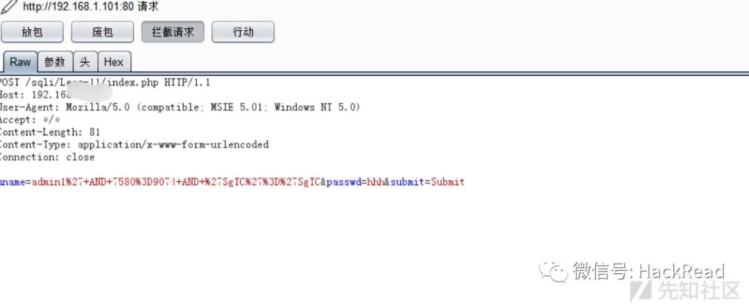 在注入天书中有post型注入,随便选了一个11关卡,抓取less-11关的包,注入点在登录框这里。
