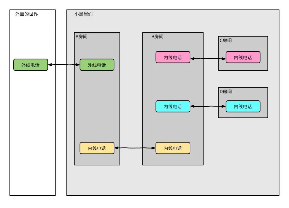 B房间,可以与多个房间进行通话,不同房间之间无法直接通话,即B房间为域内的网关域控