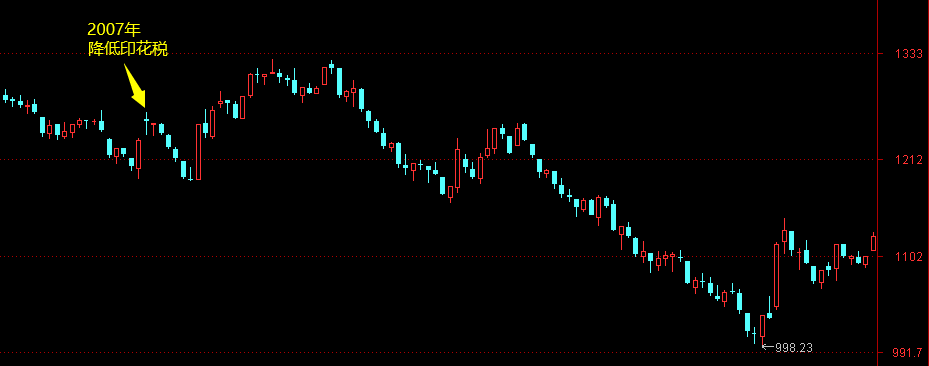 4)2001年11月16日,印花税由4‰下调到2‰,调整之后,沪指有过一段100多点的行情。