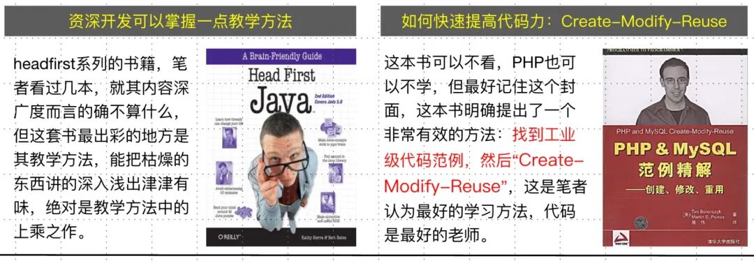✧ 关于教学方法:工作多年的资深开发,一般都要承担传道授业解惑的职责,作为他人导师,通常技术能力和知识结构都没有太大问题,但可以有意识地修炼一下自己的教学方法。headfirst系列的书籍,笔者看过几本,就教学方法而言绝对是上乘之作。