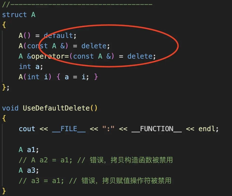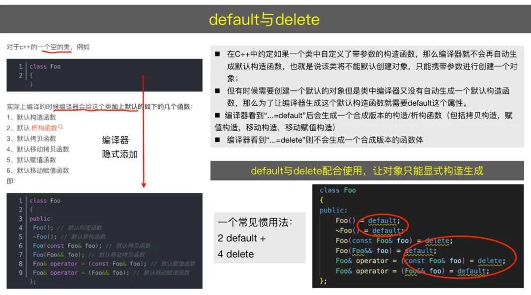 explicit:只能显示构造,禁止隐式构造 (例如,允许A a(1); 但禁止A a = 1 ) default : 声明构造函数为默认构造函数(有了=default,就不用显式定义函数体了) delete : 禁止对象的拷贝与赋值 delele函数在c++11中很常用,std::unique_ptr就是通过delete修饰来禁止对象的拷贝的。